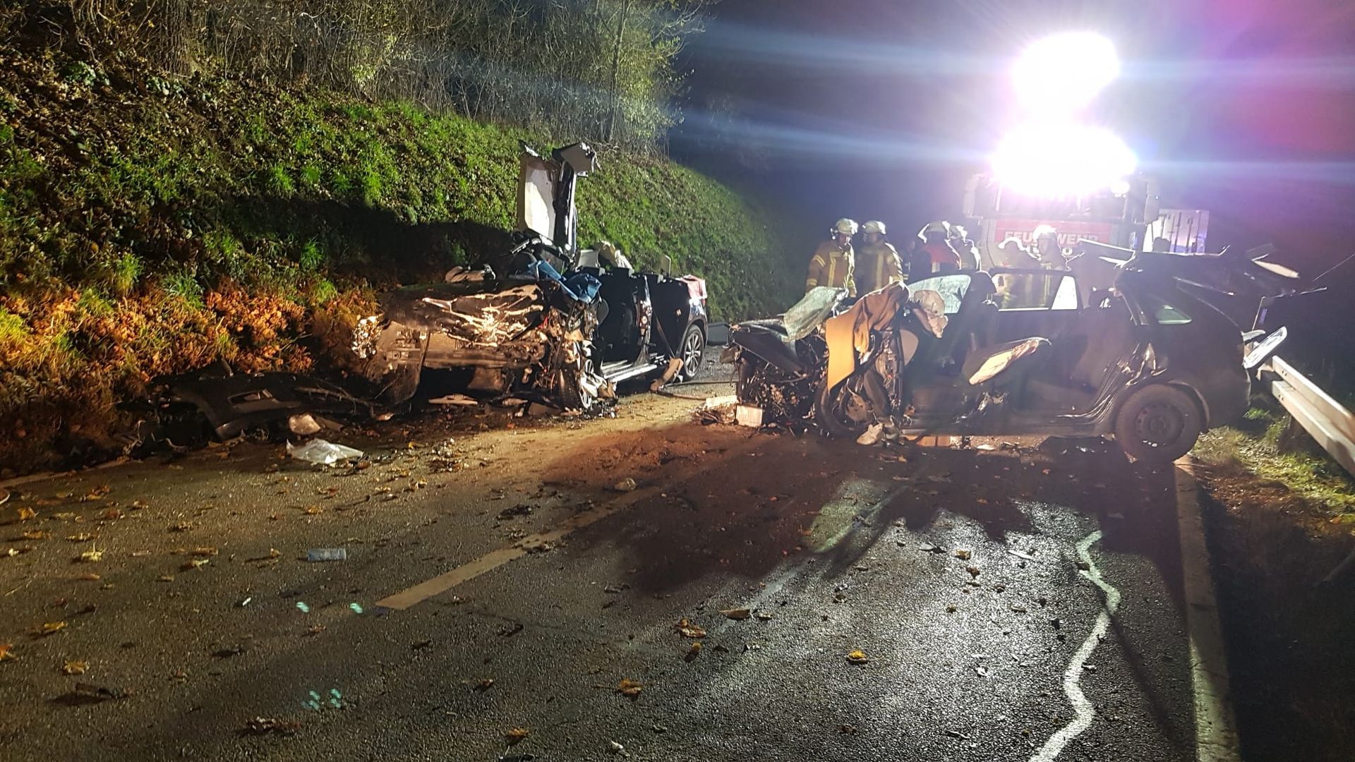 Auf der ST2230 von Solnhofen nach Zimmern kollidierten zwei PKW frontal miteinander. Auch ein paar dahinterfahrende PKWs erlitten leichte Schäden. Die Insassen der beiden PKW mussten mit schwerem Schneidgerät aus ihren Fahrzeugen befreit werden.